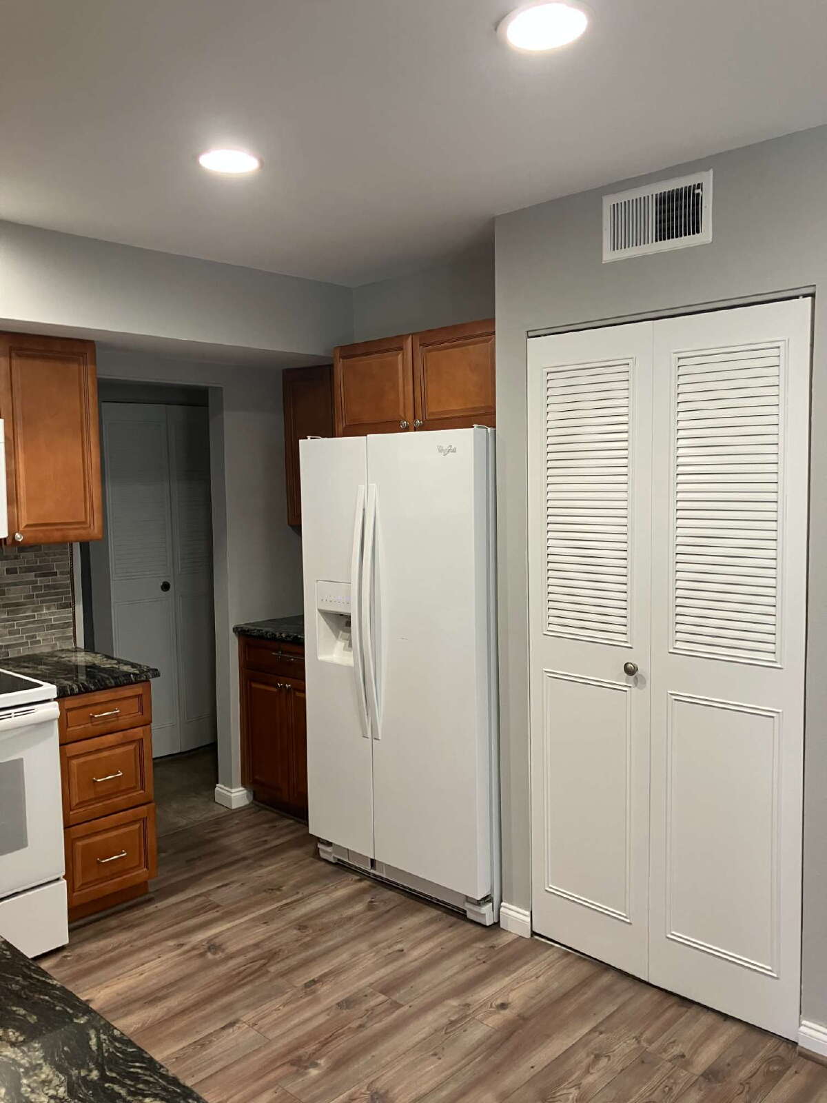 The kitchen includes a full appliance package with an electric stove and a pantry closet for additional storage. Central air conditioning provides year-round comfort.